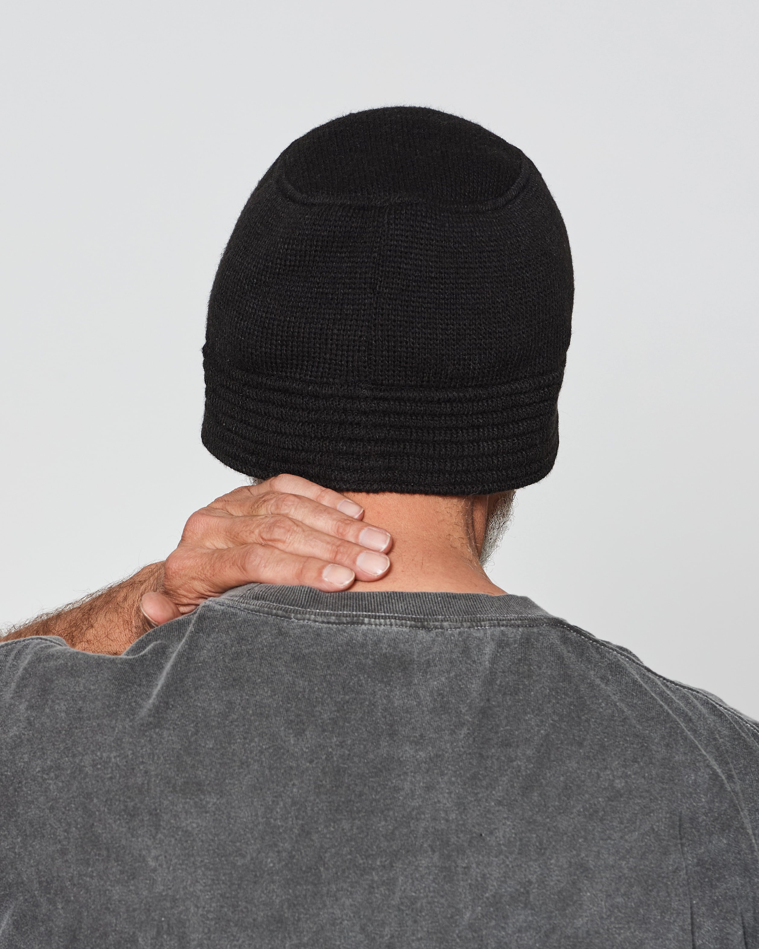 ニット製品の為、自分の頭のサイズに合わせて伸ばしながら、自分なりに形を整えた被り方が可能となっています。