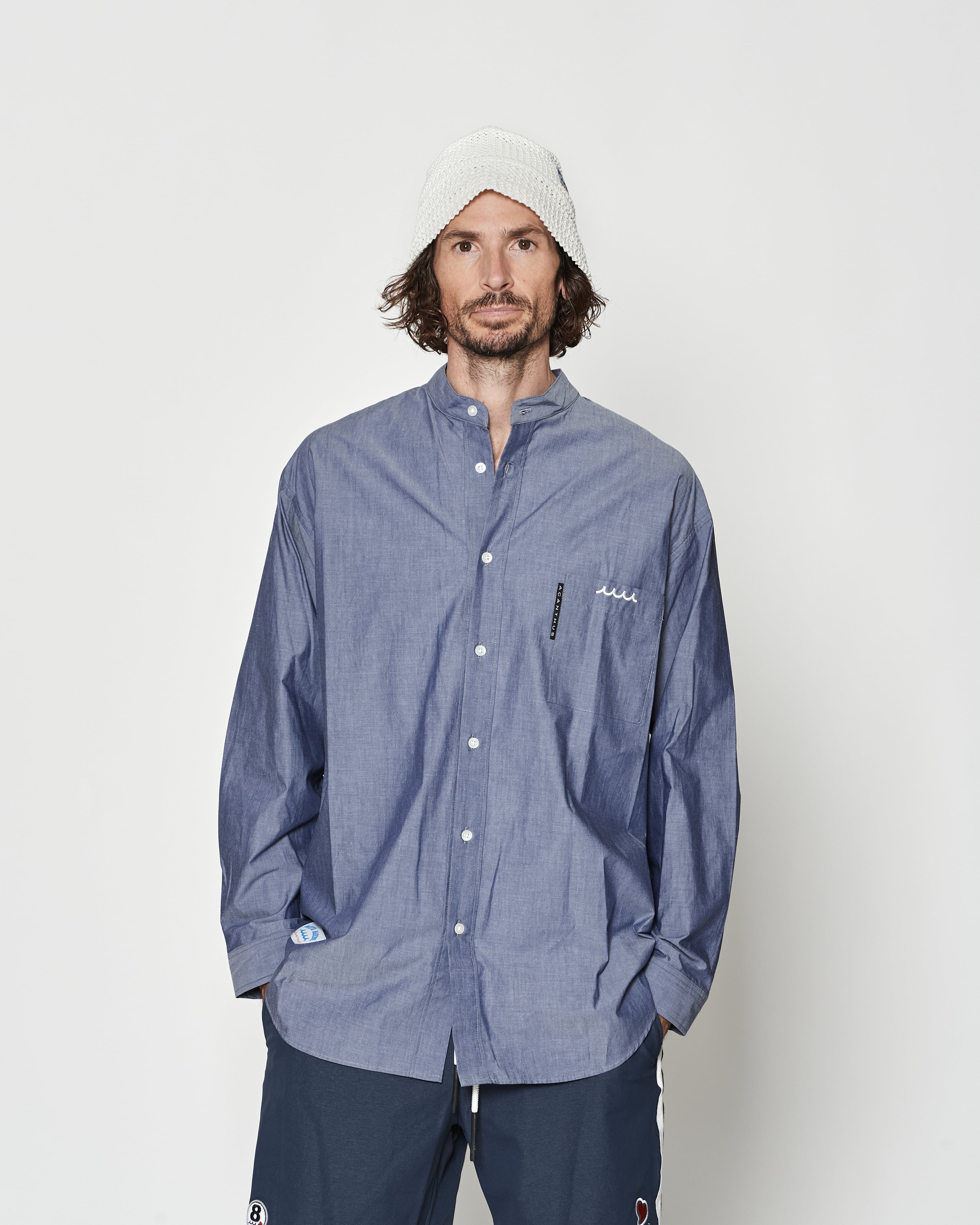 オーバーサイズシルエットで構築したバンドカラーシャツ。