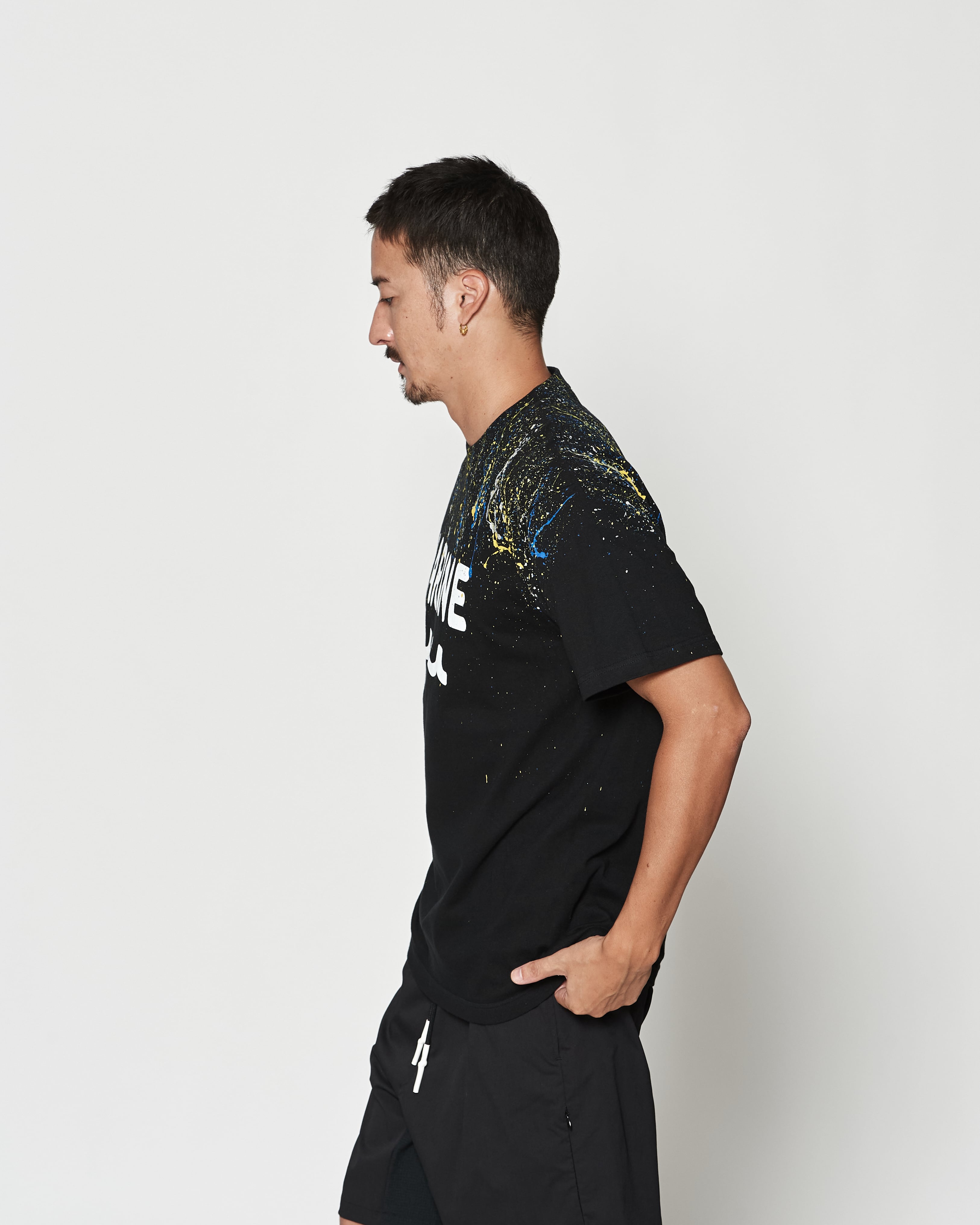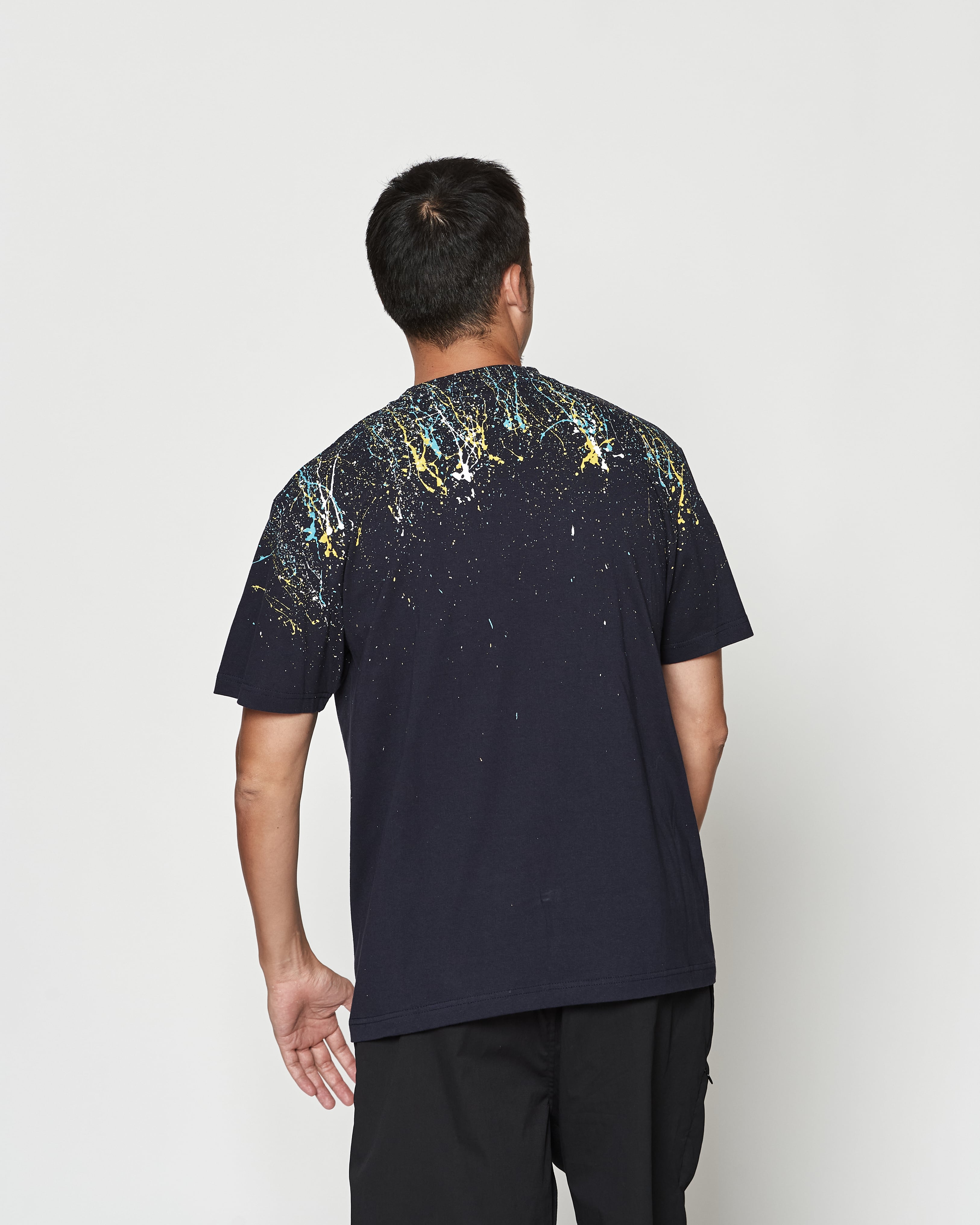 染料が降りそそいだようなスプラッシュ加工を手作業にて施し、プリントでは表現できないムラ感と立体感を表現しています。