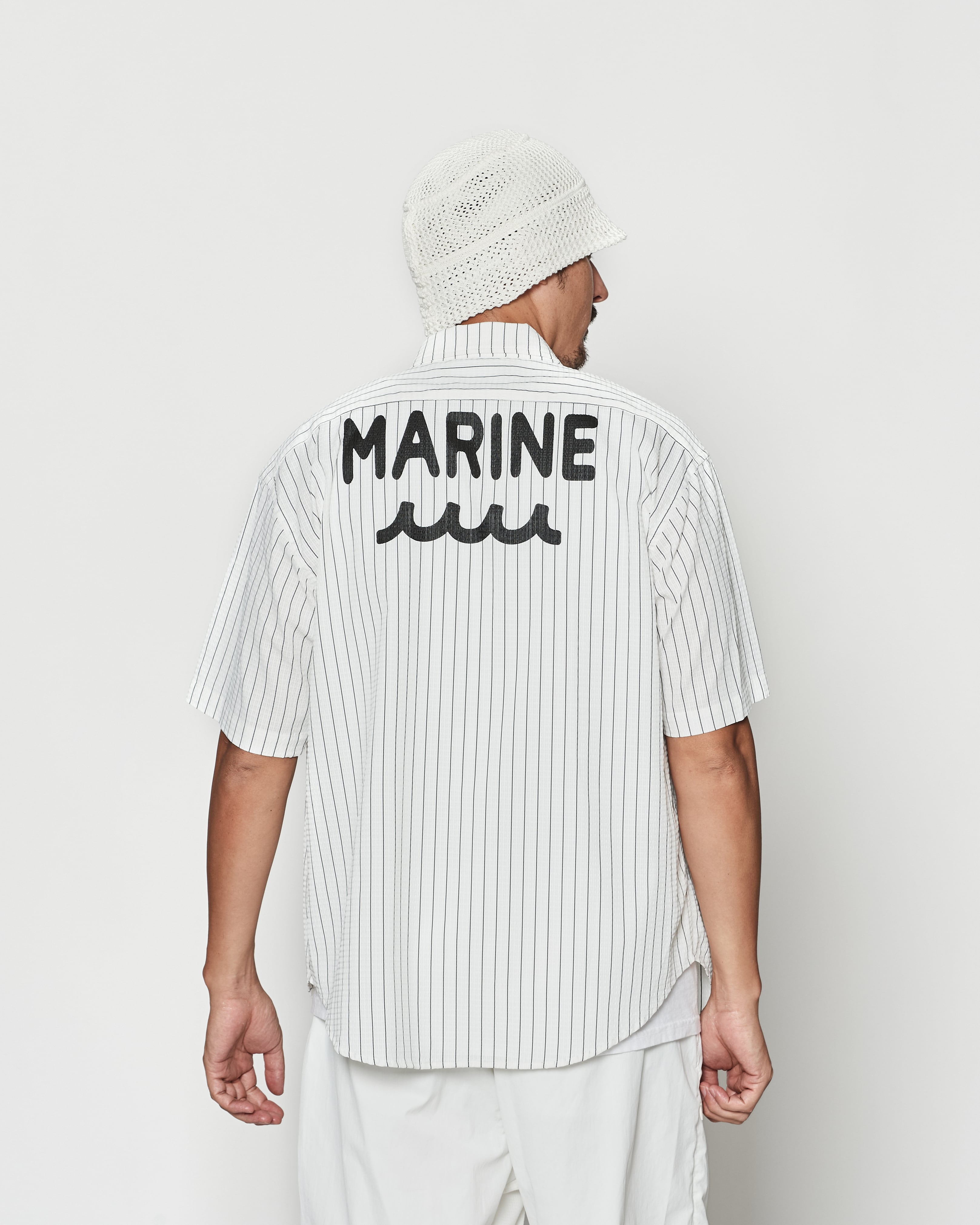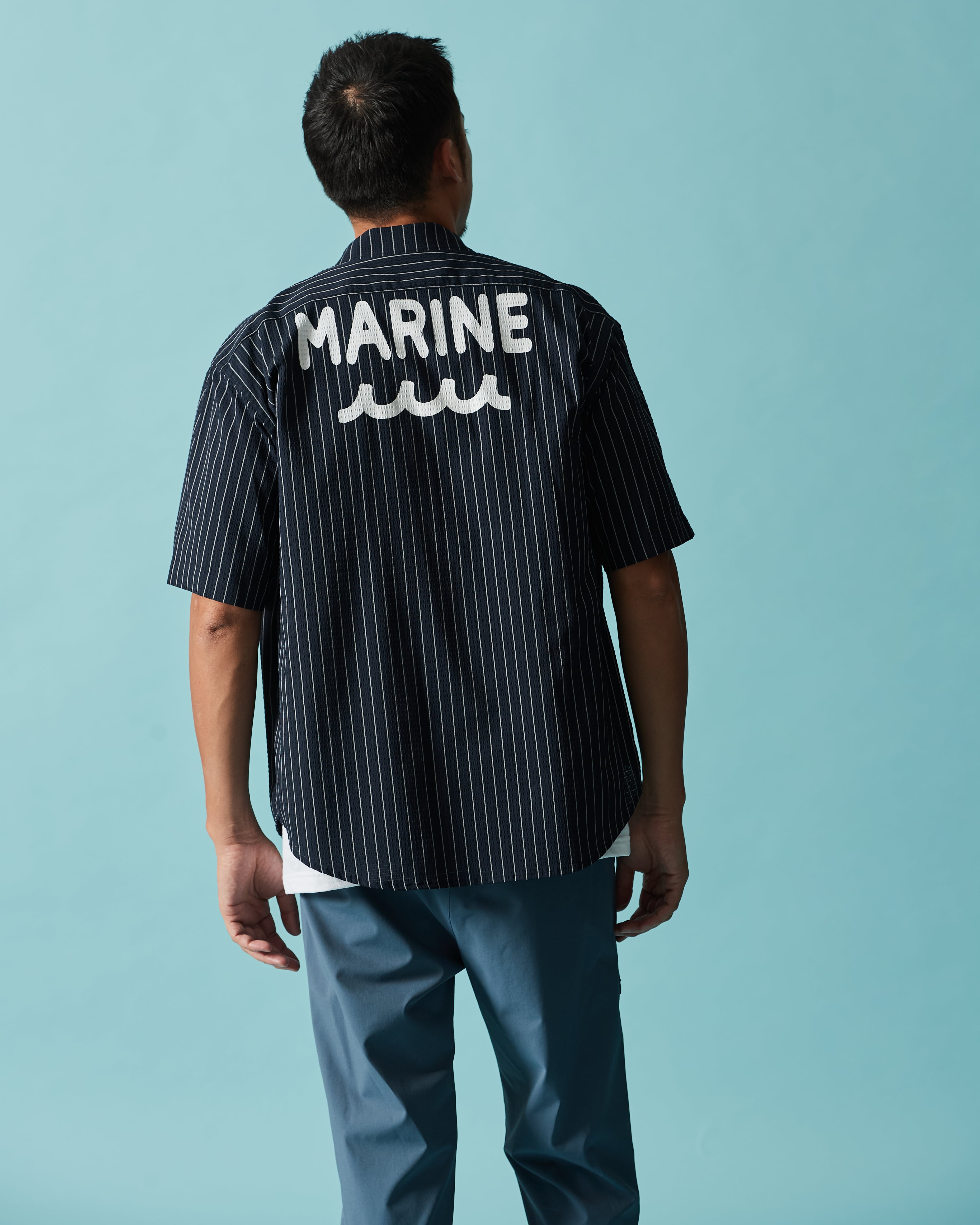 バックにはポップなMUTA MARINEロゴのシルクスクリーンプリントを施しています。