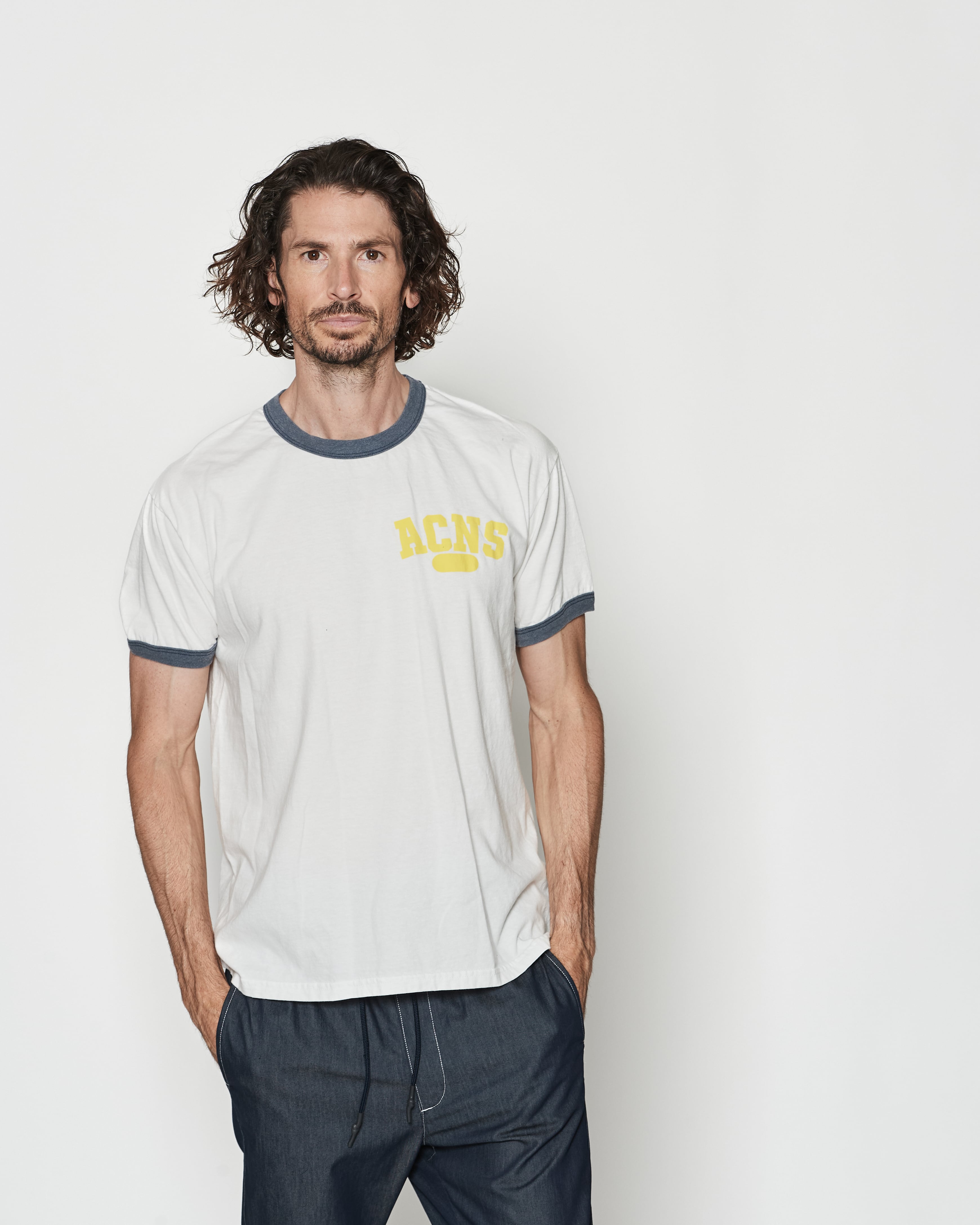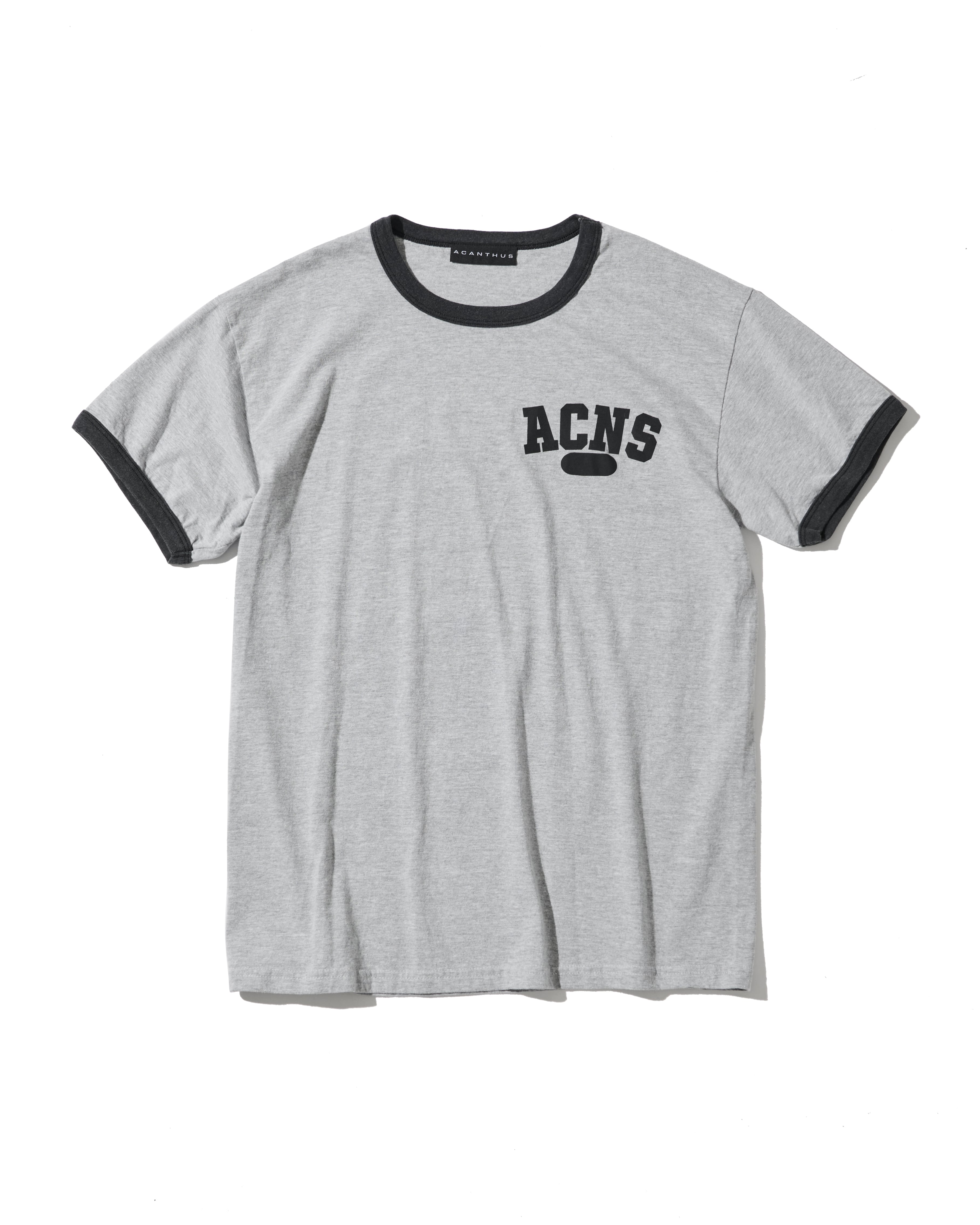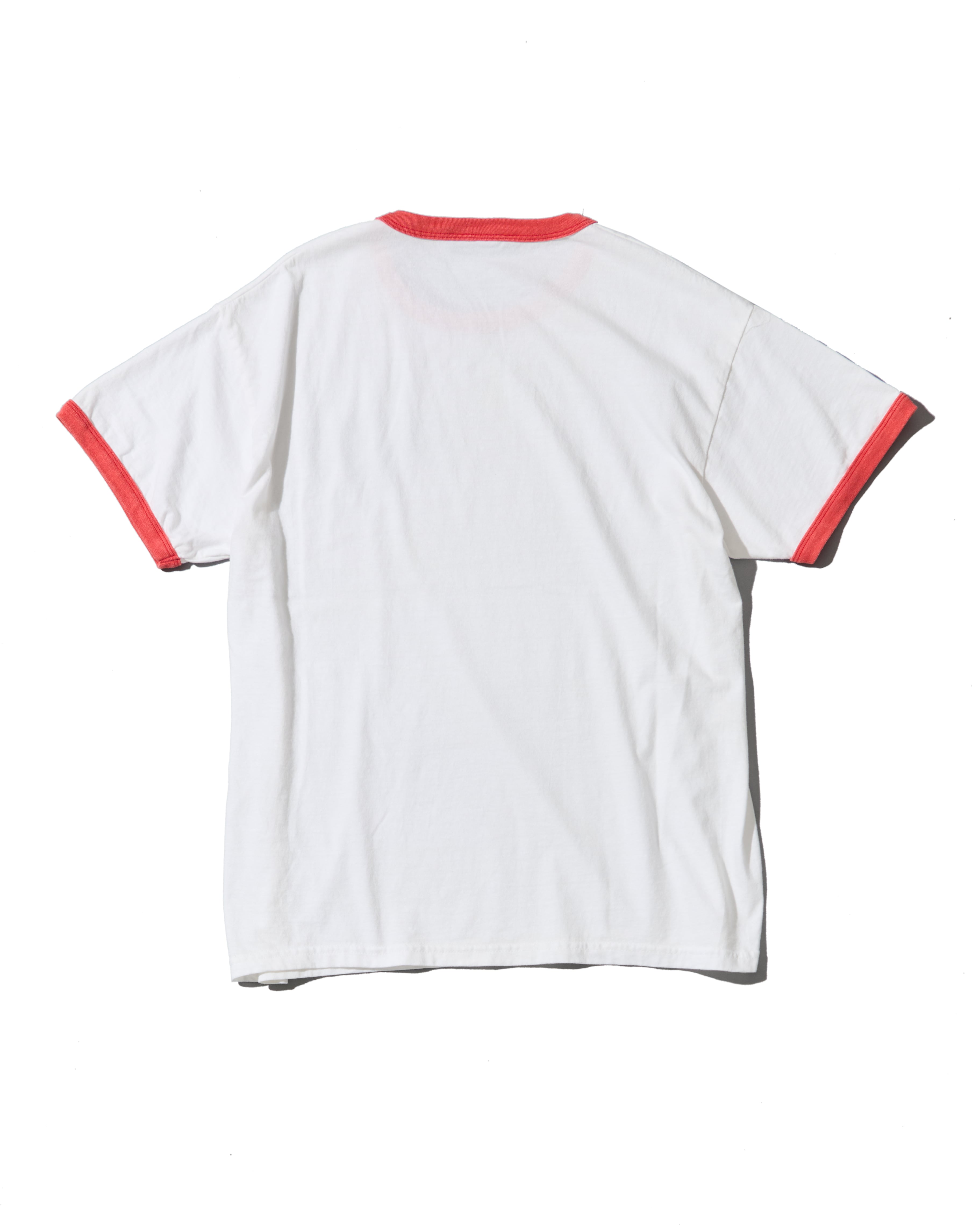 首フライスは2本針縫製、丸胴に編み立てた身頃を使用したオーセンティックなシルエットのリンガーTシャツ。