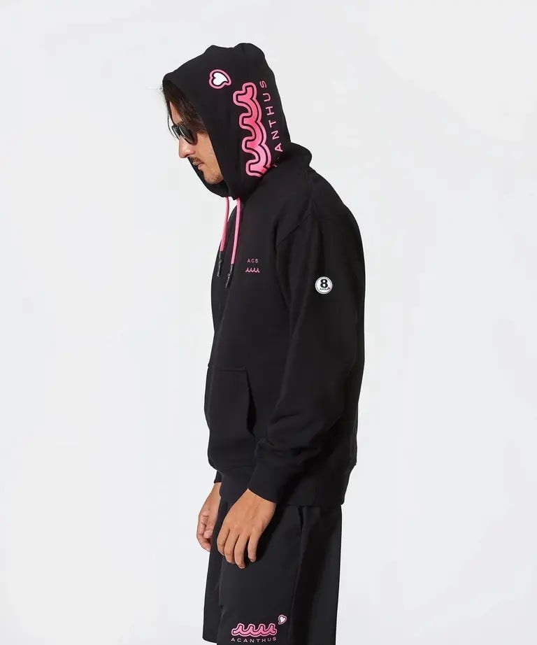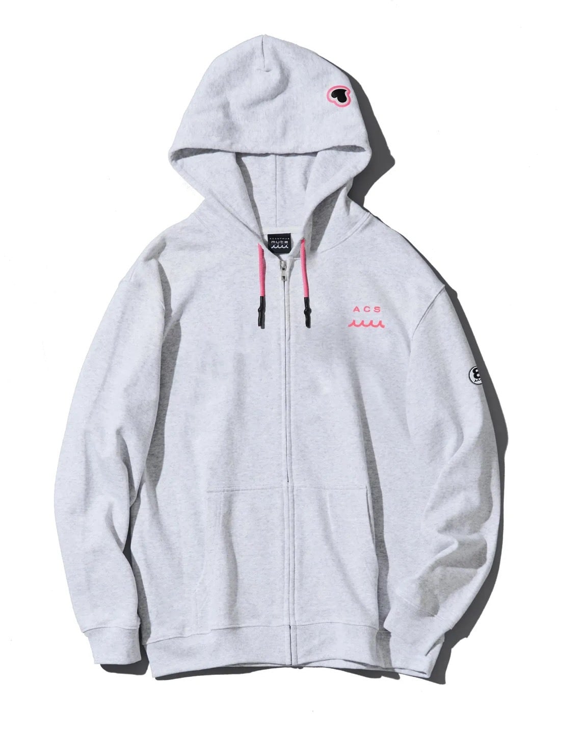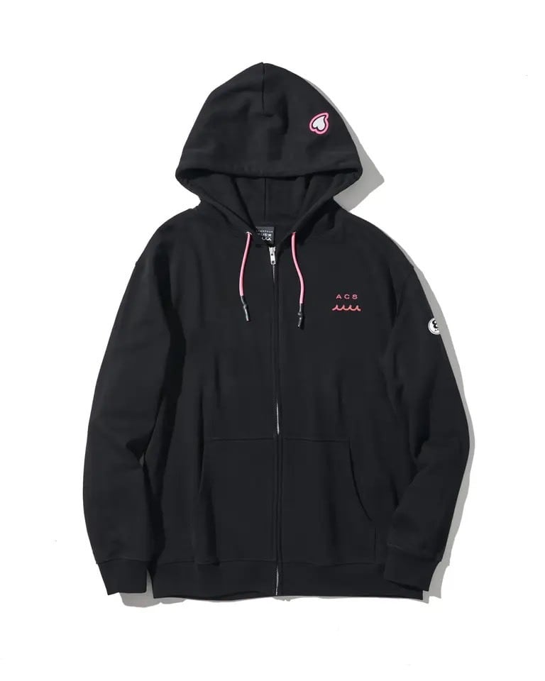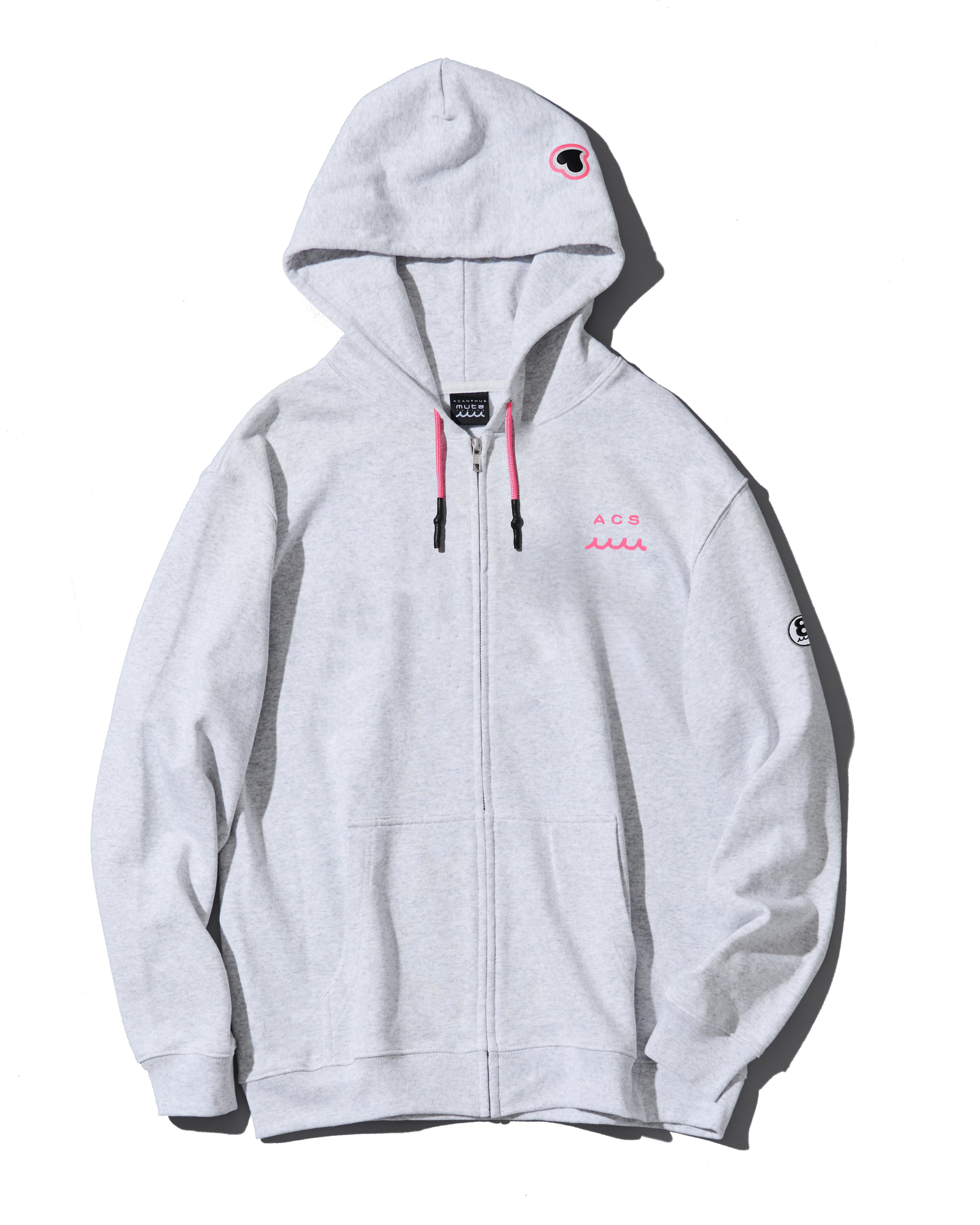 フードにはインパクトあるACANTHUS×mutaのコラボロゴデザインの発泡プリントを、左胸にWAVE+ACSロゴを刺繍、左腕にはサークルワッペンを配置。