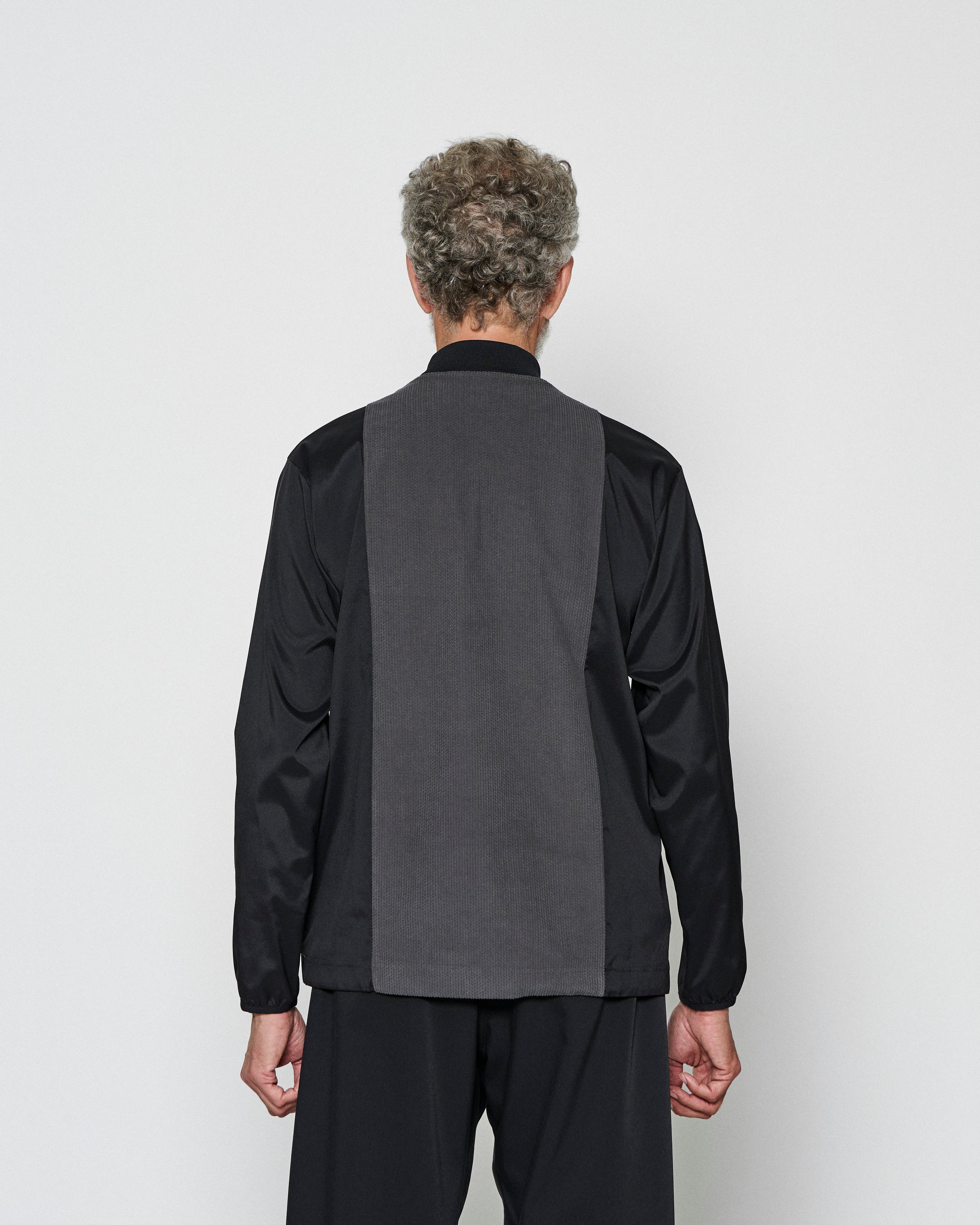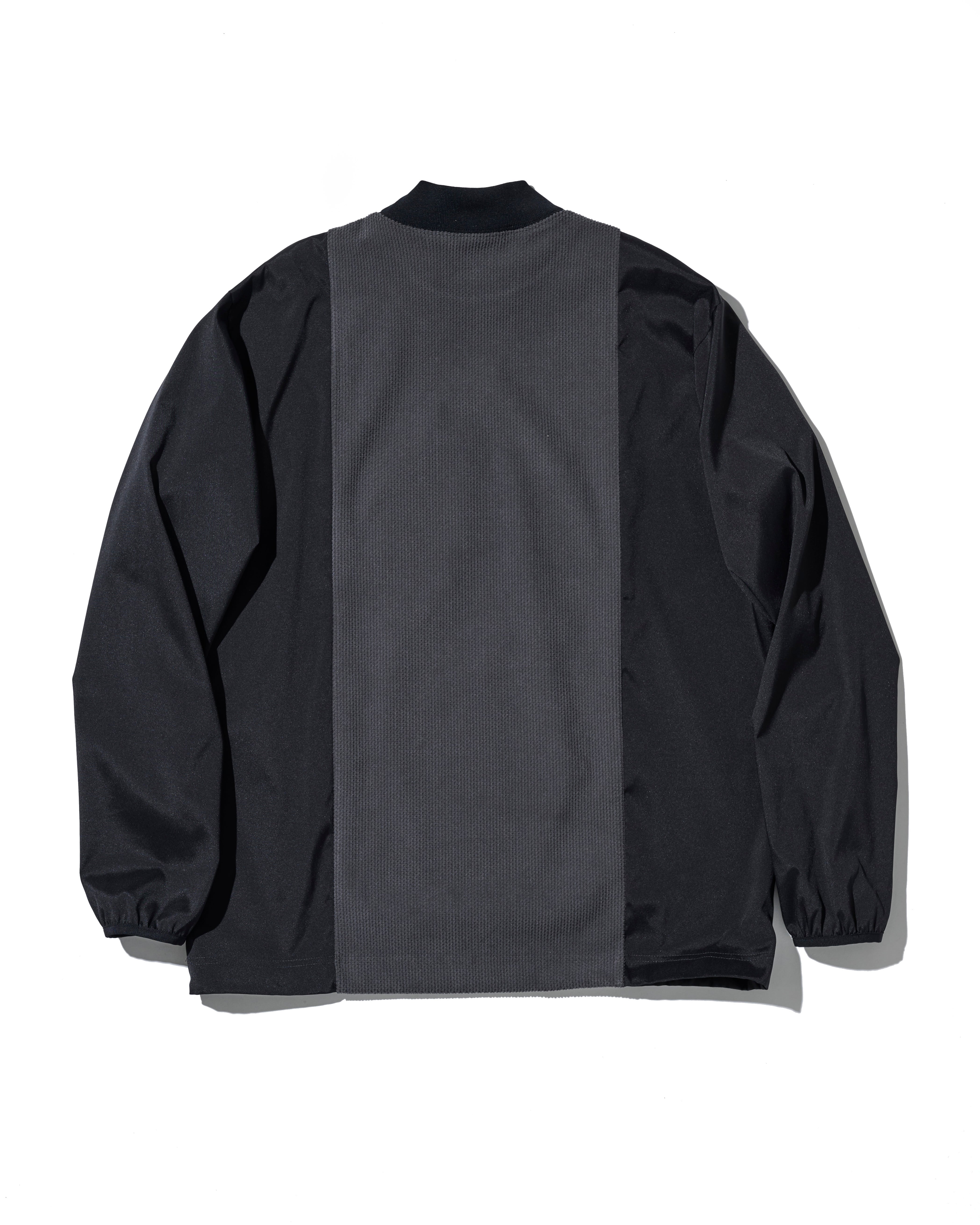 起毛感の有るコーデュロイ、撥水性と光沢感の有る二重織り、異なる機能的なポリエステル生地で切り替えたモックネックトップ。左胸には筆記体ロゴ刺繍を施したポケット付き。裾はゴムドローコードにて調整可能です。