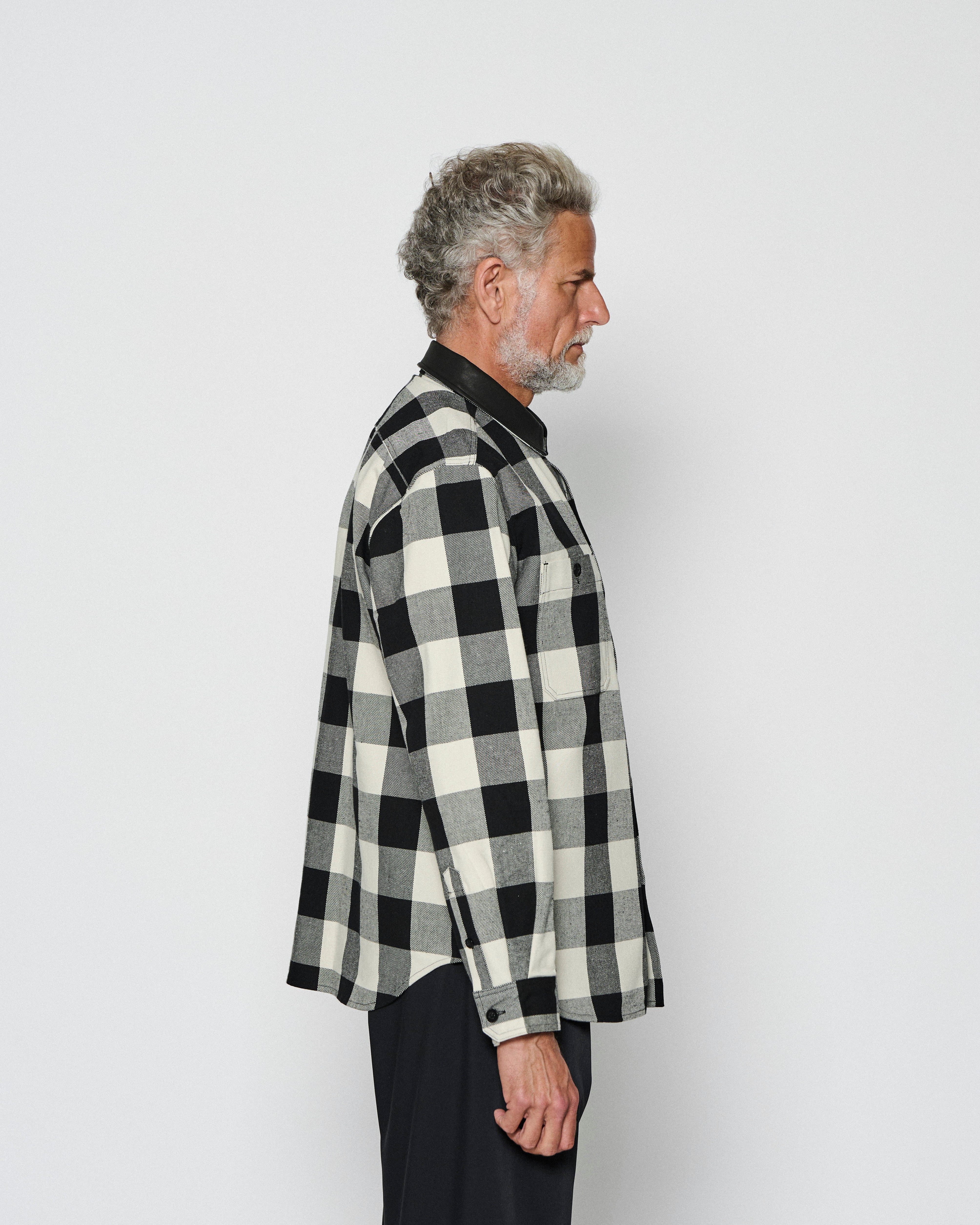 適度な厚みを持つコットン素材に、クラシックなバッファローチェック柄を落とし込んだファブリックを採用。しっかりとした打ち込みによるドライなタッチと、程よいコシのある風合いが特徴。着用と洗いを重ねることで柔らかさが増し、チェック柄にも自然なフェード感が生まれる経年変化も楽しめる素材となっています。