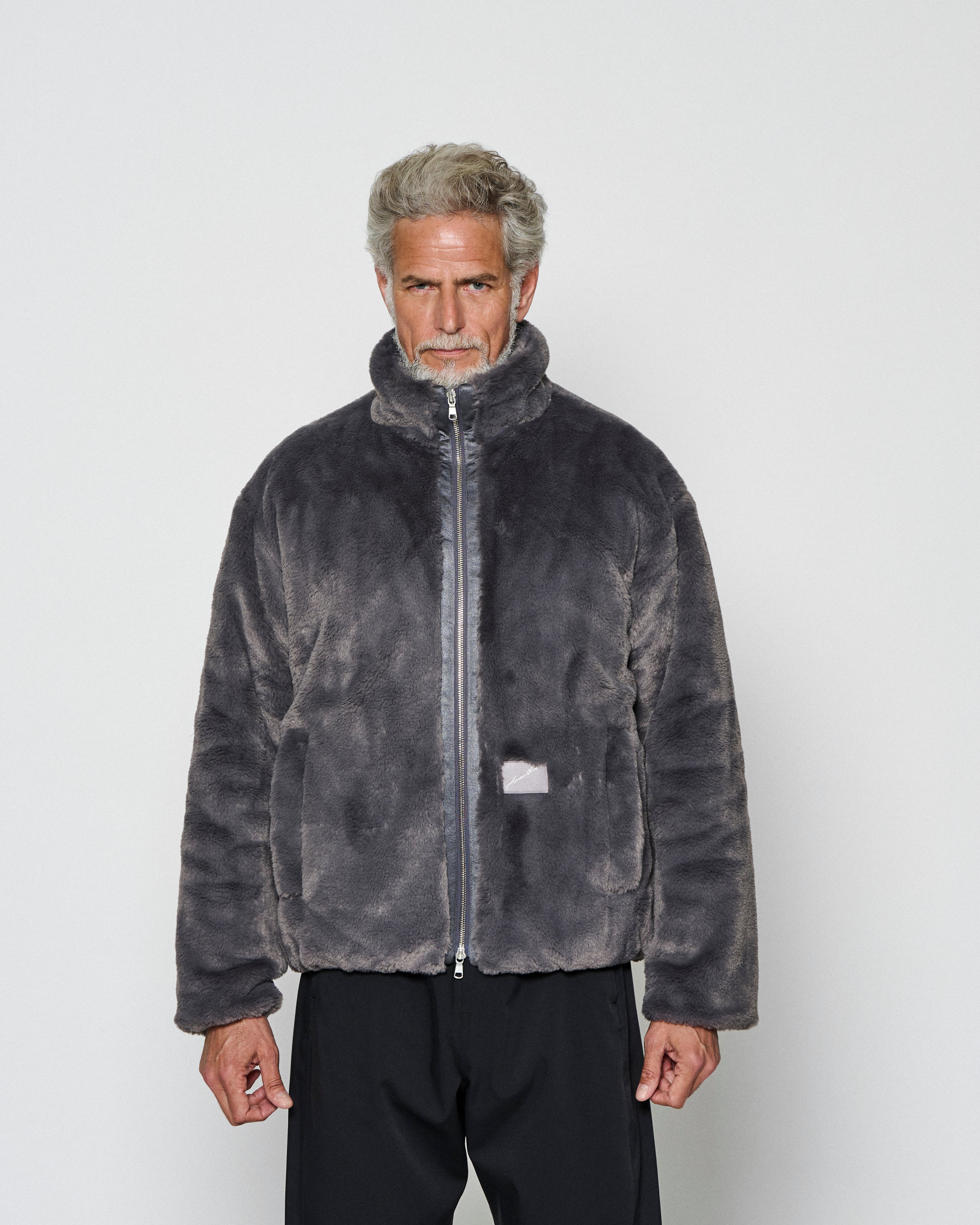 滑らかで上質なフェイクファー素材を使用したファーブルゾン。ファー素材を生かす為にディティールを削ぎ落したリラックスシルエット。裏地全体には保温性に優れた中綿を挟み込んだキルティング生地を使用しています。左前下には筆記体ロゴを刺繍したフェルトパッチを取り付けています。