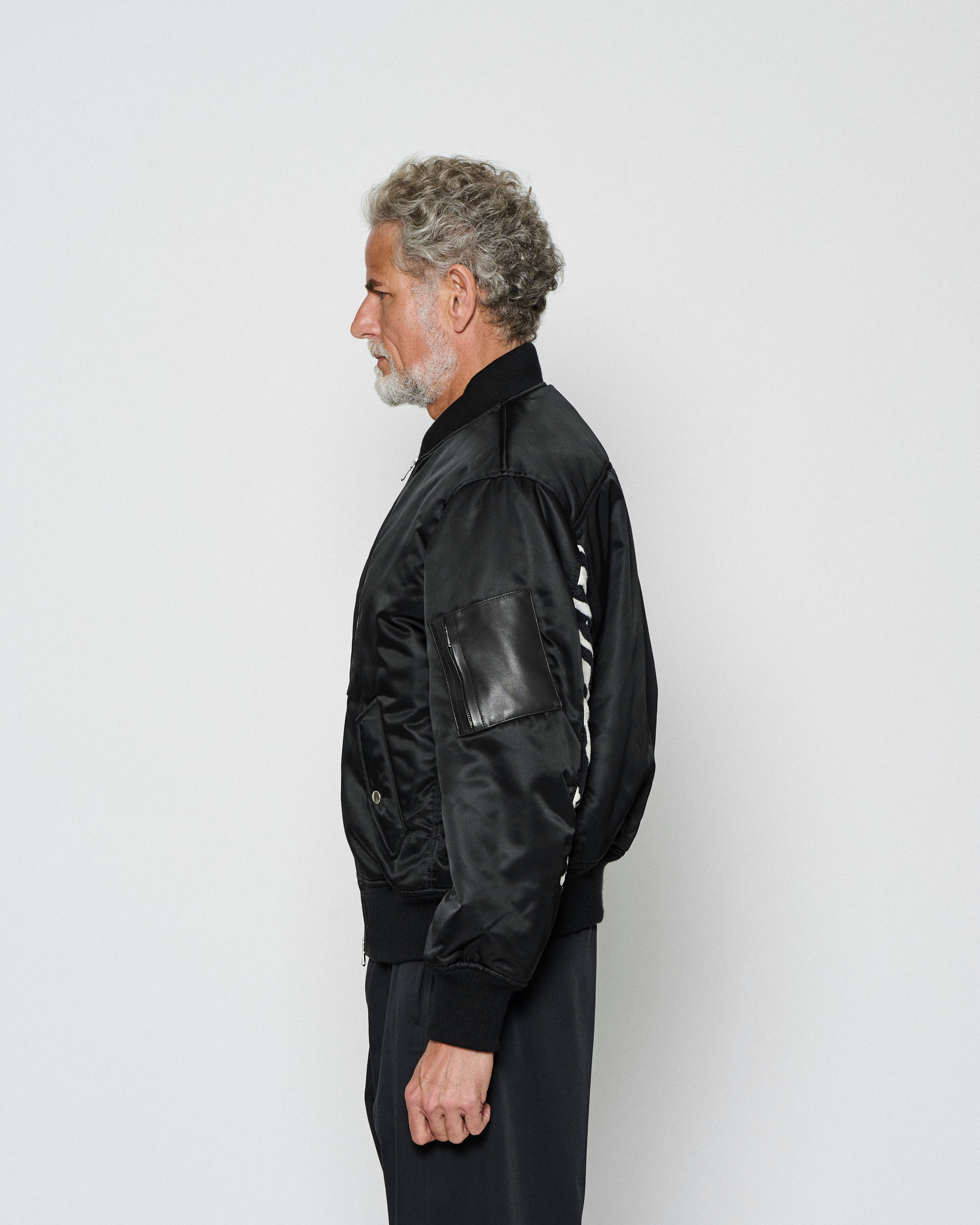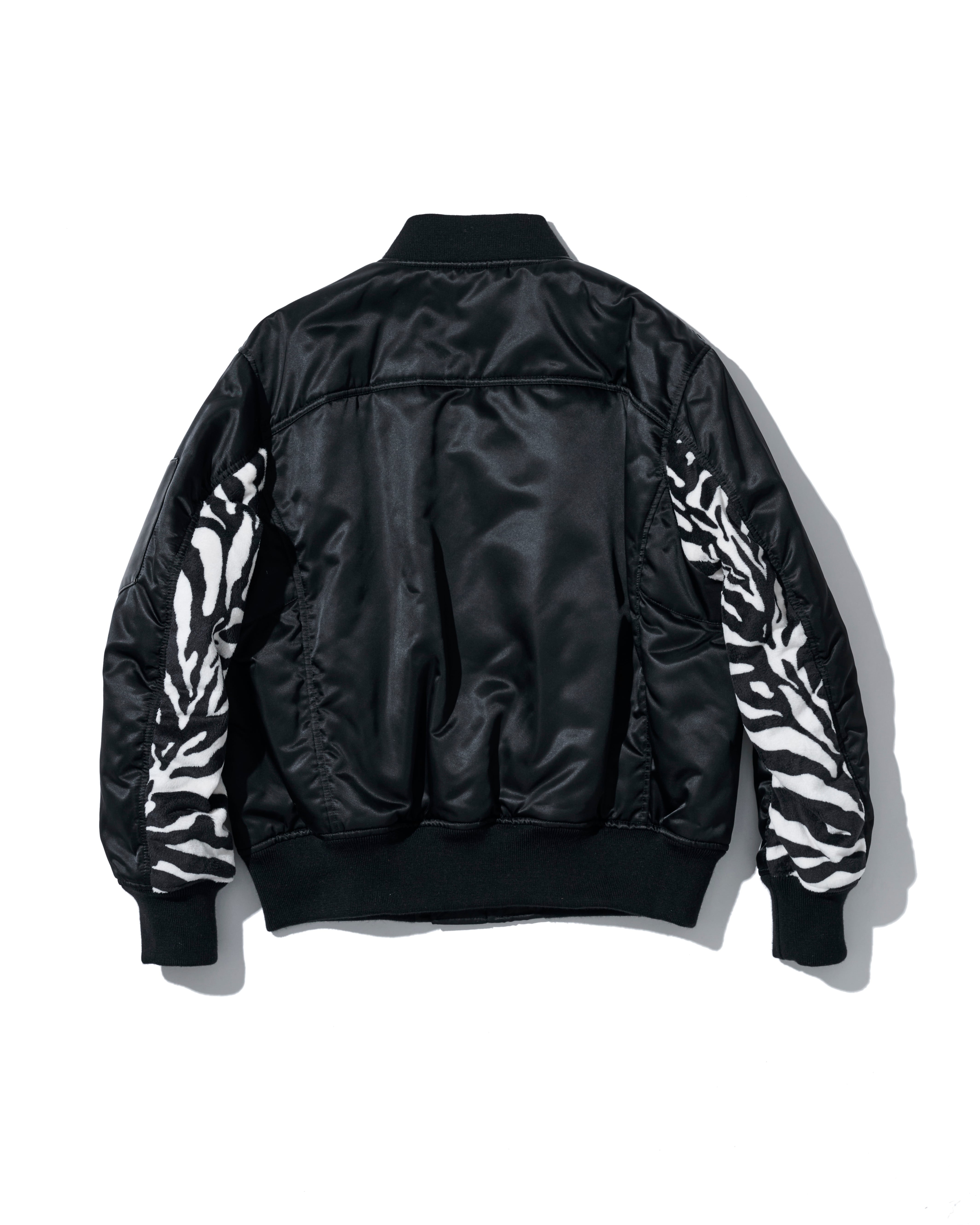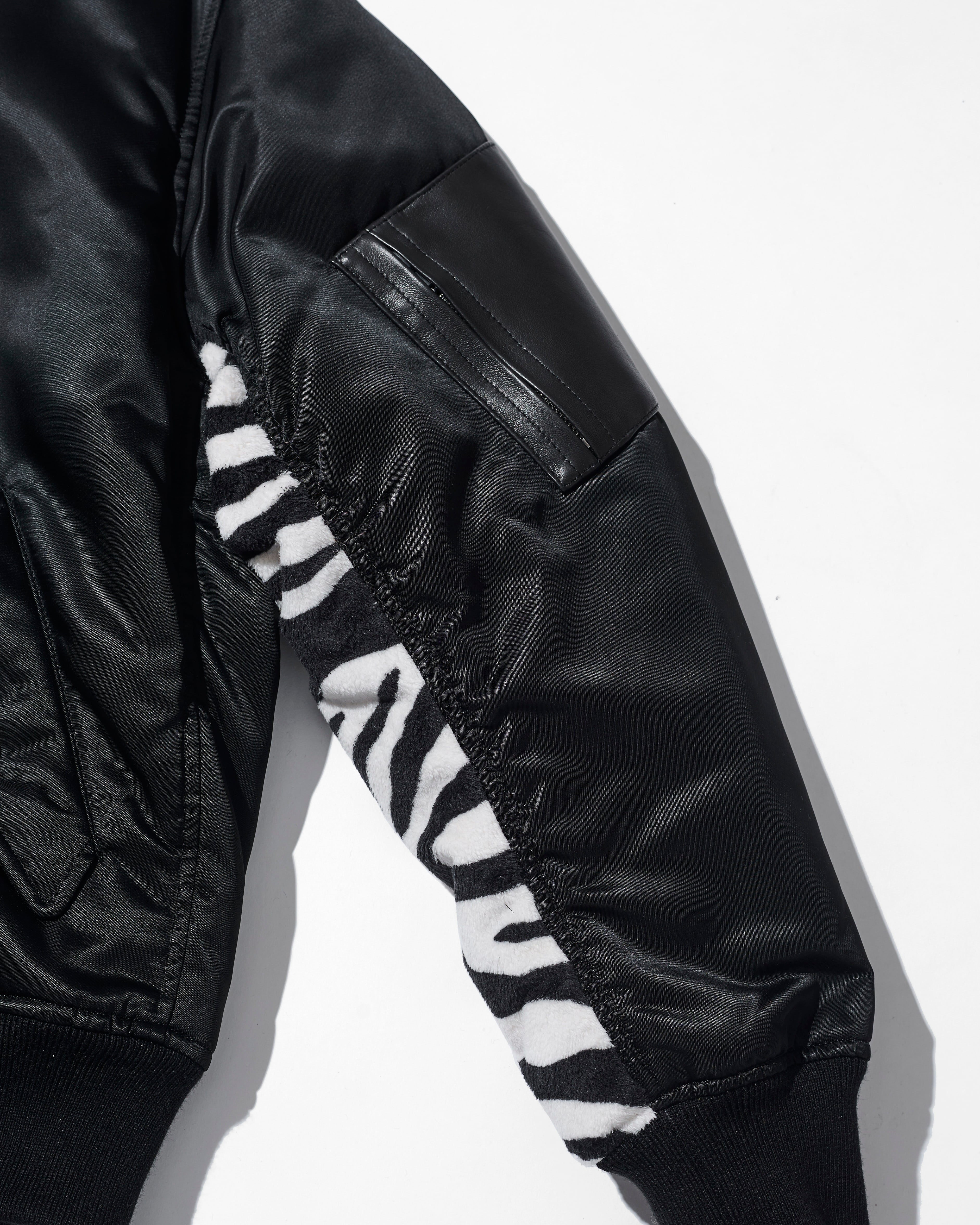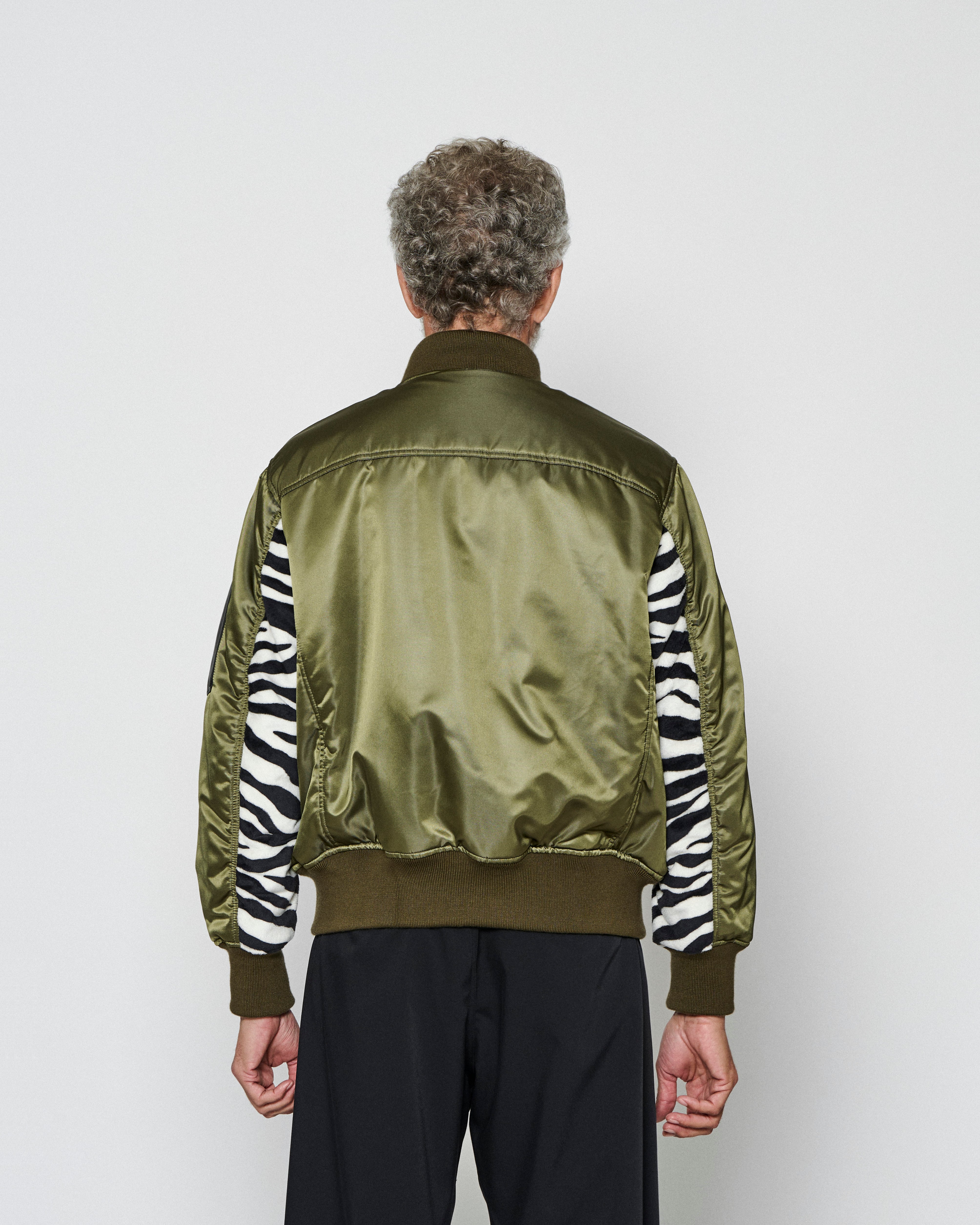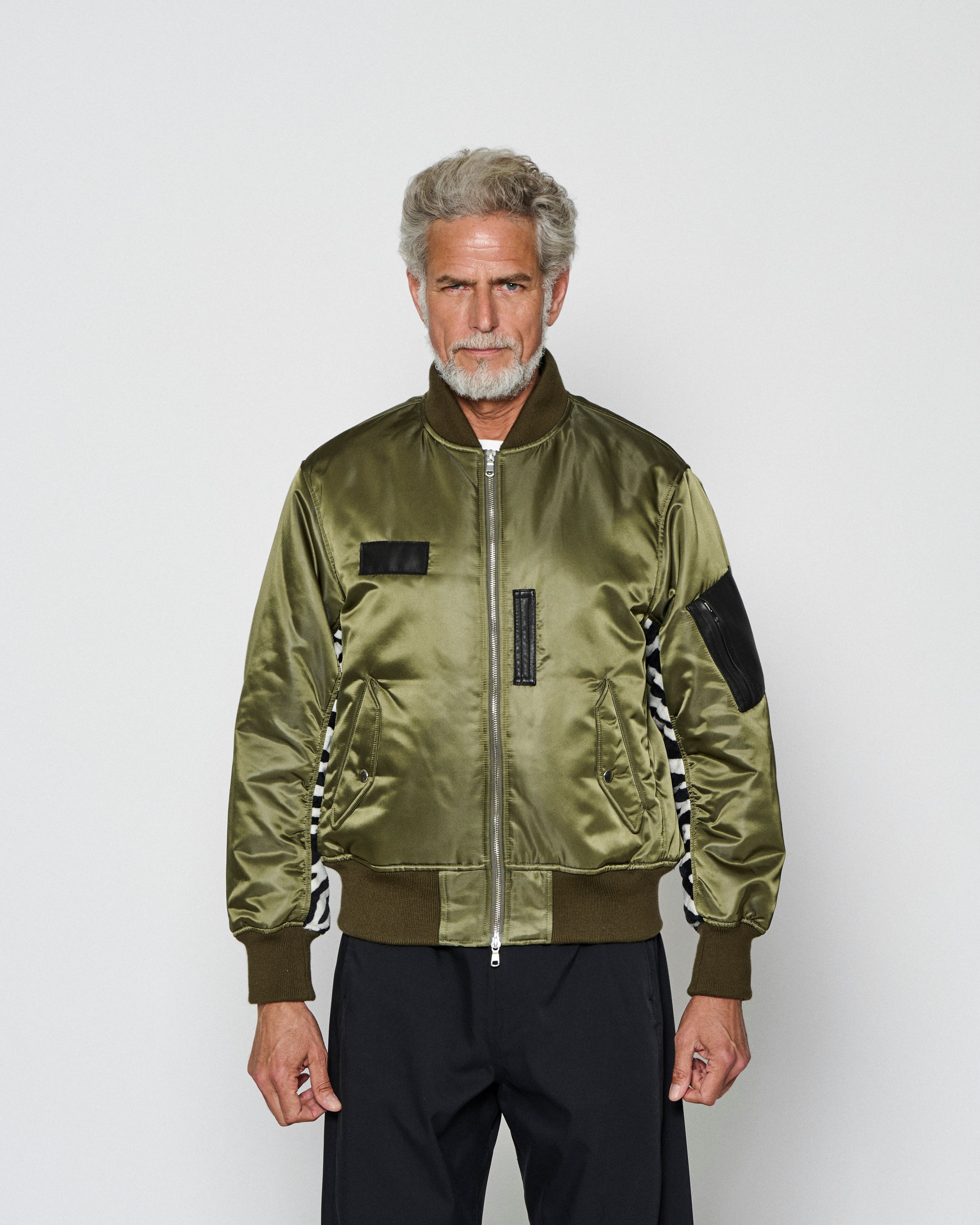 今シーズンはパターンを見直しゆとりも持たせたシルエットのリニューアルした、LIMONTA社ナイロン生地を使用したMA-1ブルゾン。内袖にはゼブラ柄のマイクロファー素材を切り替えて使用しています。身頃裏、袋布には起毛生地、袖には肌滑りの良いポリエステル素材を使用しています。ファスナーには軽量性とメッキの高級感を持つYKK社のMATALUXEを使用。全体に厚めの中綿を挟み込む事によって保温性を高めています。ウール配合のリブはオリジナルで編み立てた物を使用。フロントパッチ、左袖PKにはラムレザーを使用し、袖にはパッカリング縫製仕様を採用しています。