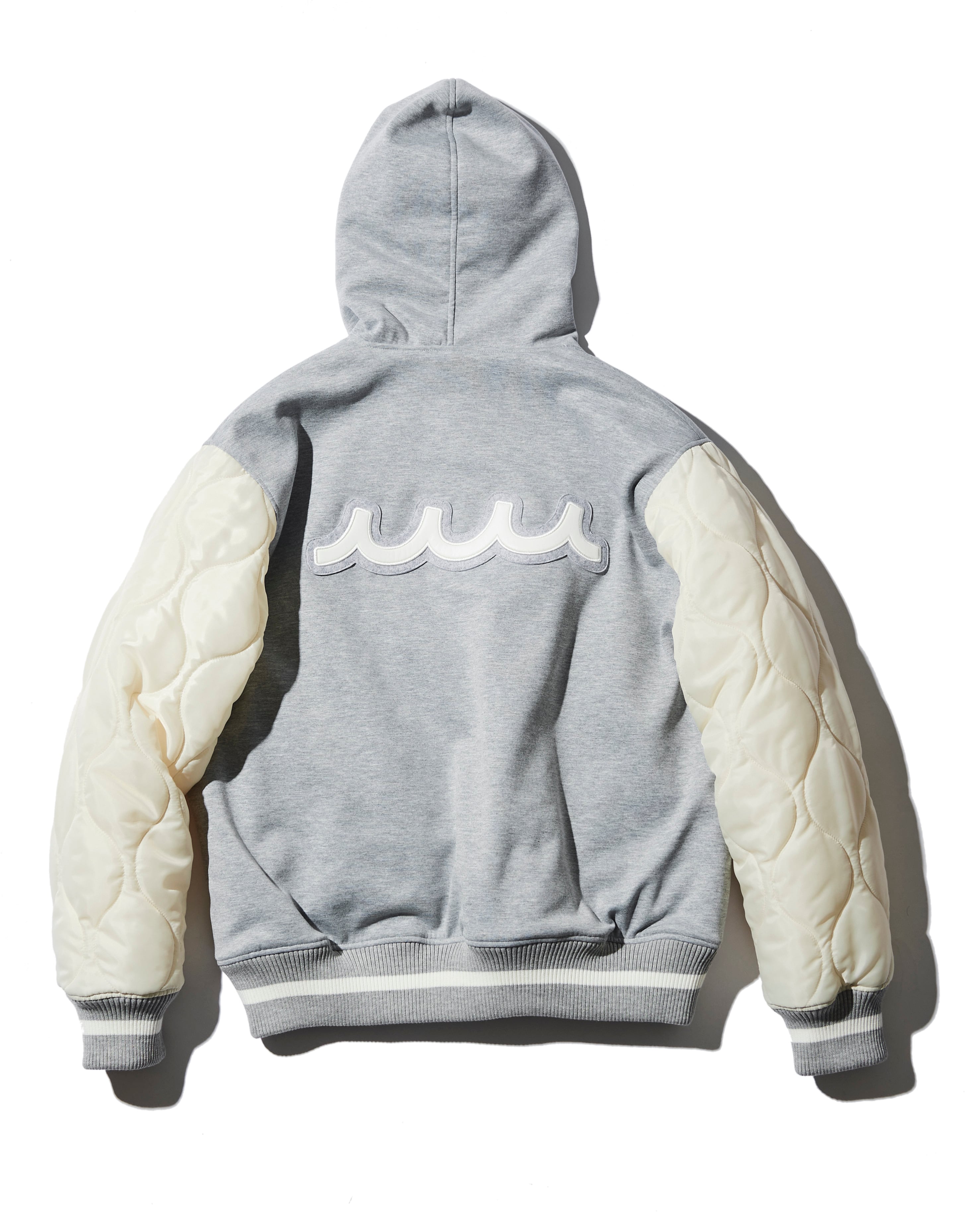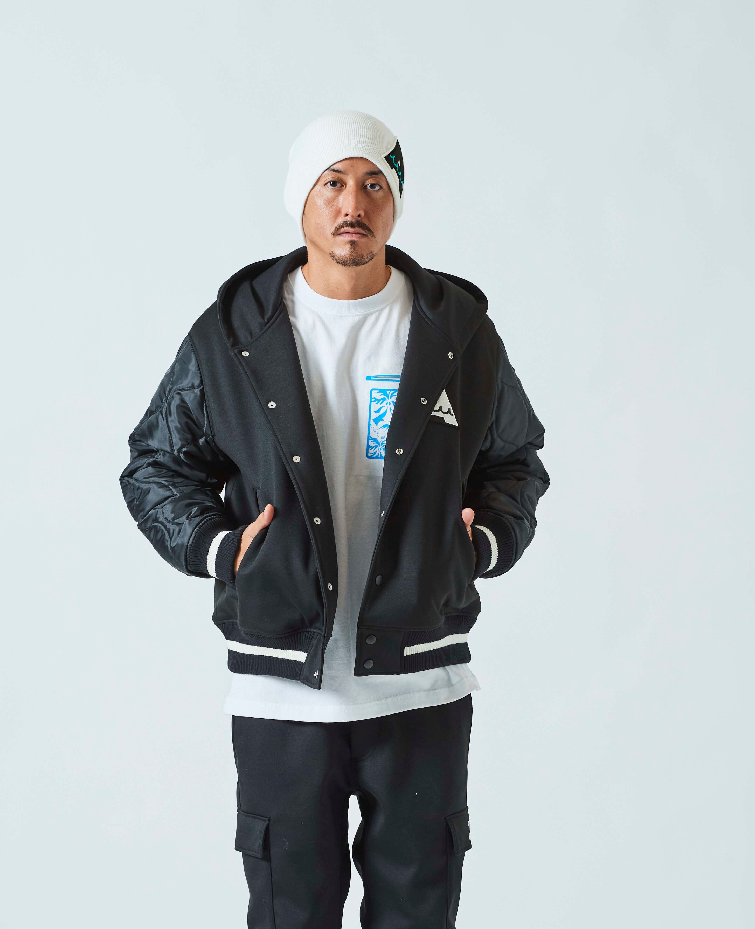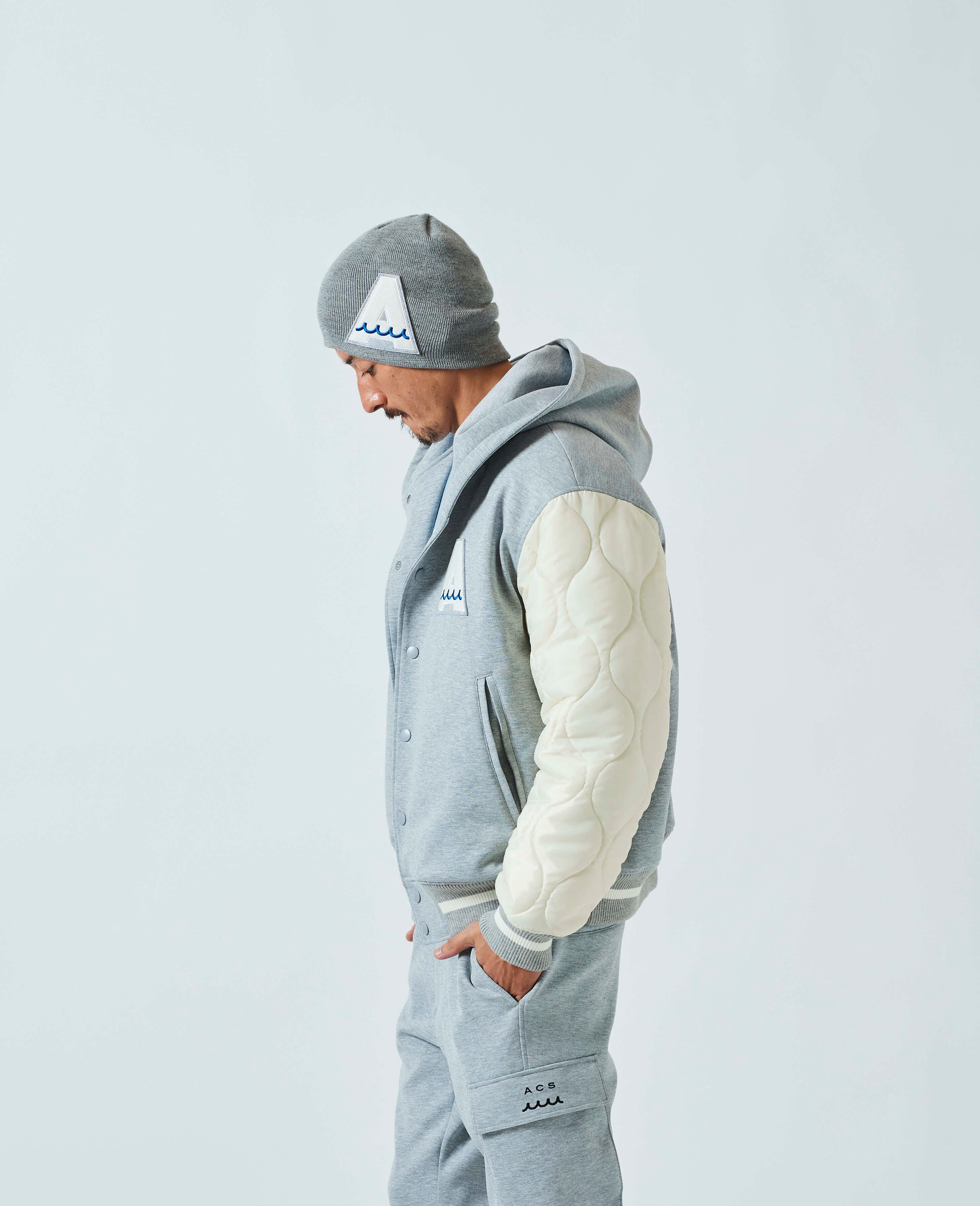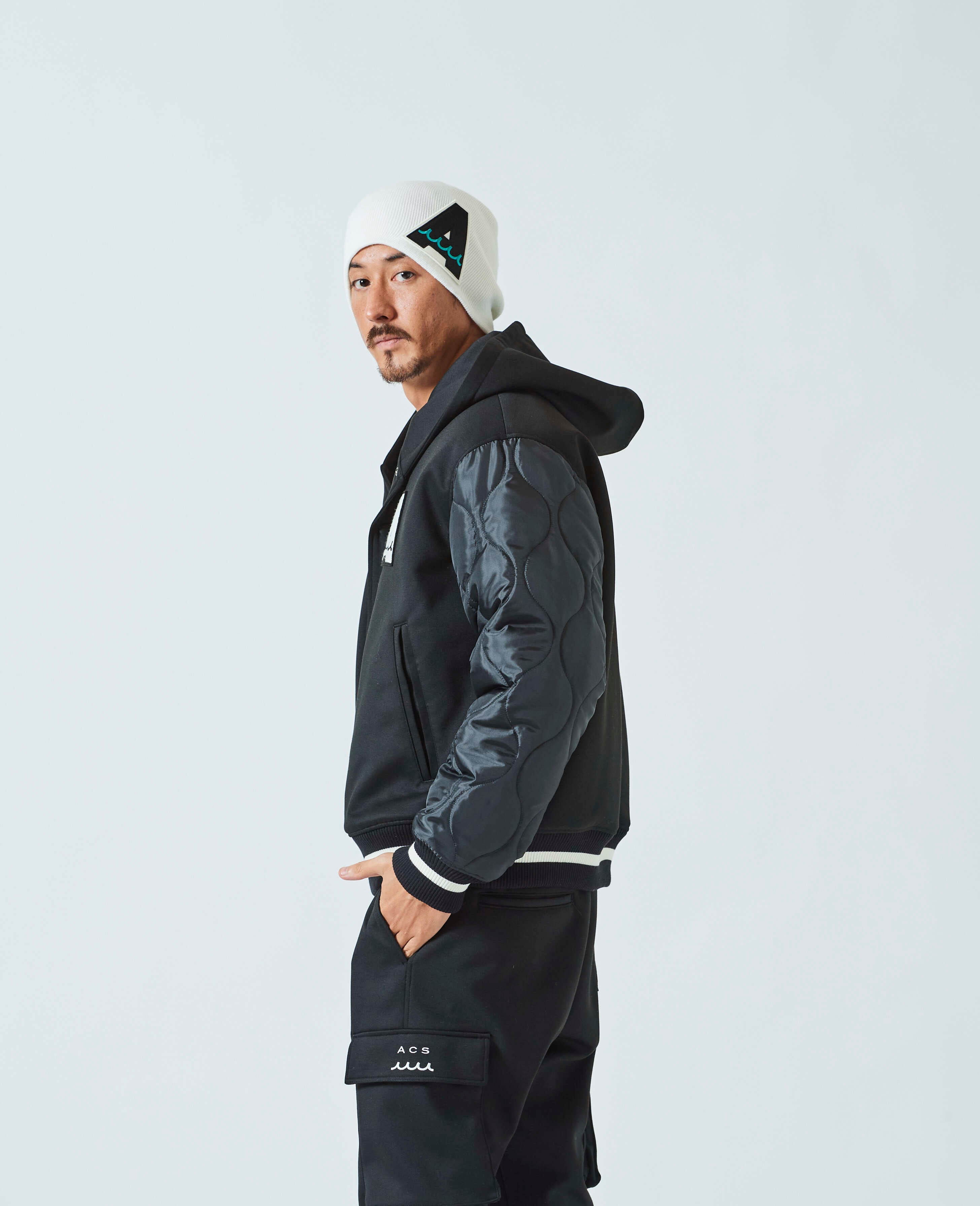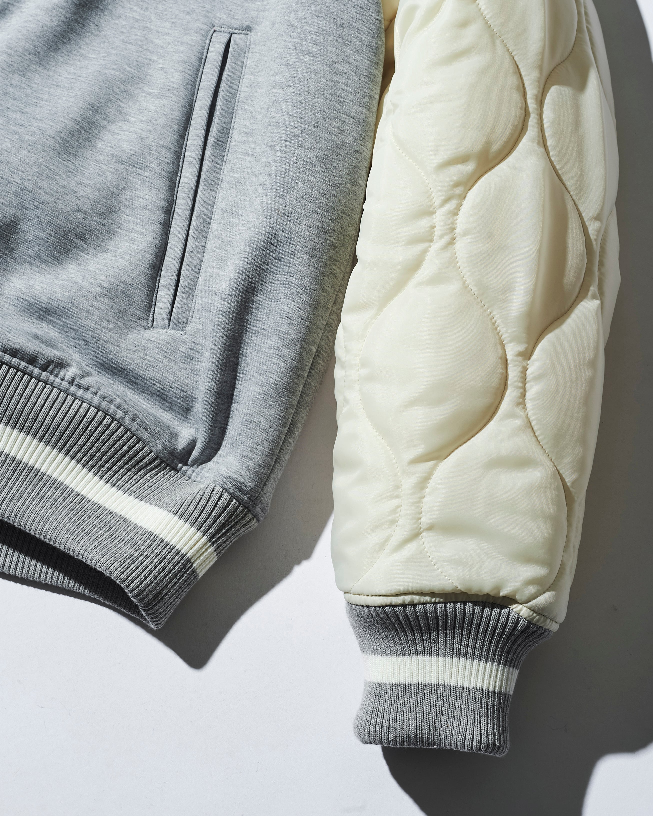 身頃にはダンボール、袖にはキルティング加工を施した生地を使用し、ライン入りのリブはオリジナルで編み立ています。