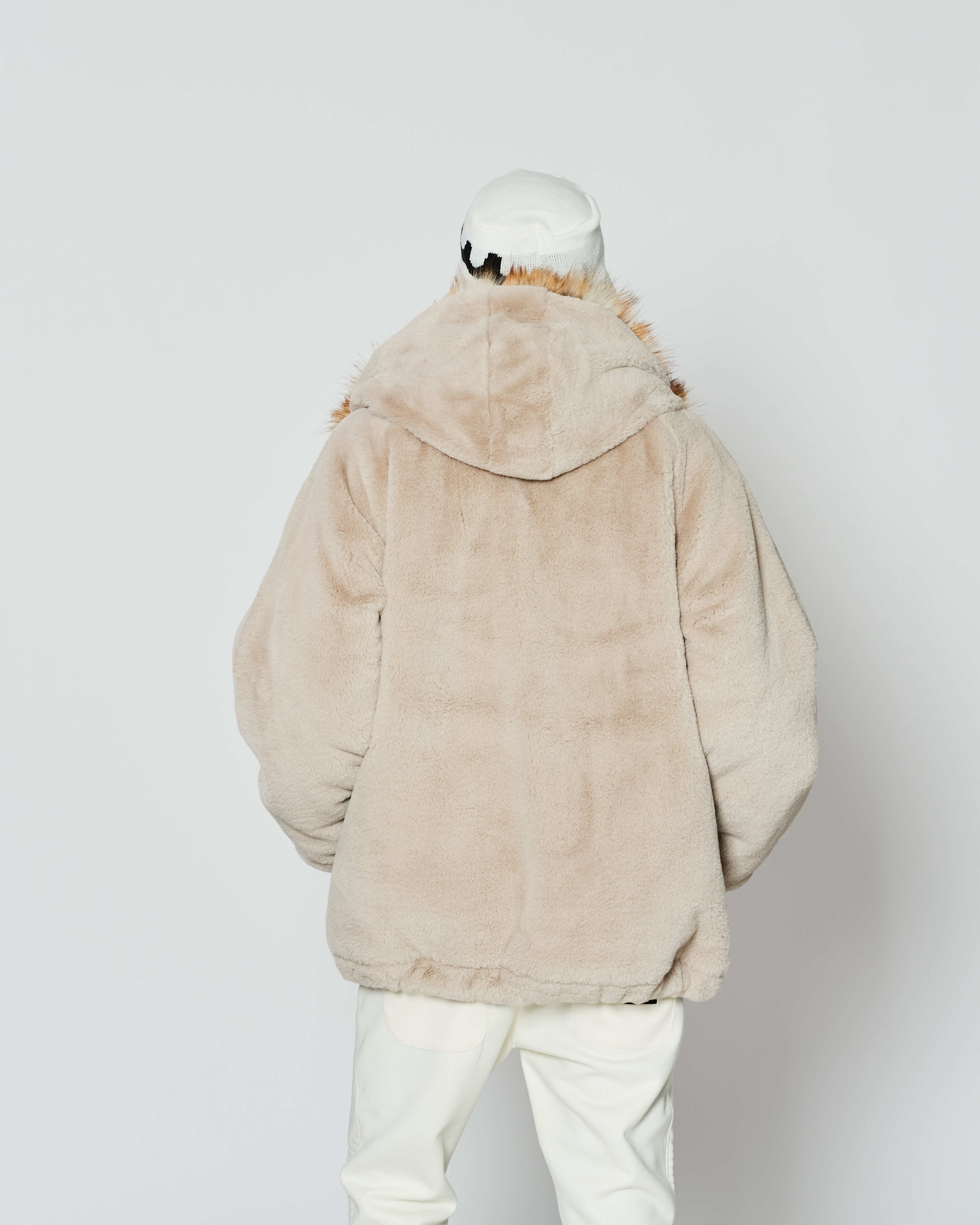 襟~フードは本来のN-3Bよりも低く設定する事で、ZIPが閉じ易く被り易いパターンに変更。フード周りのファー素材には、(株)カネカのモダアクリル原料を使用した、よりリアルファーに近い風合いを追及し開発したキャメルカラーミックスのロングヘアファー素材を使用しています。