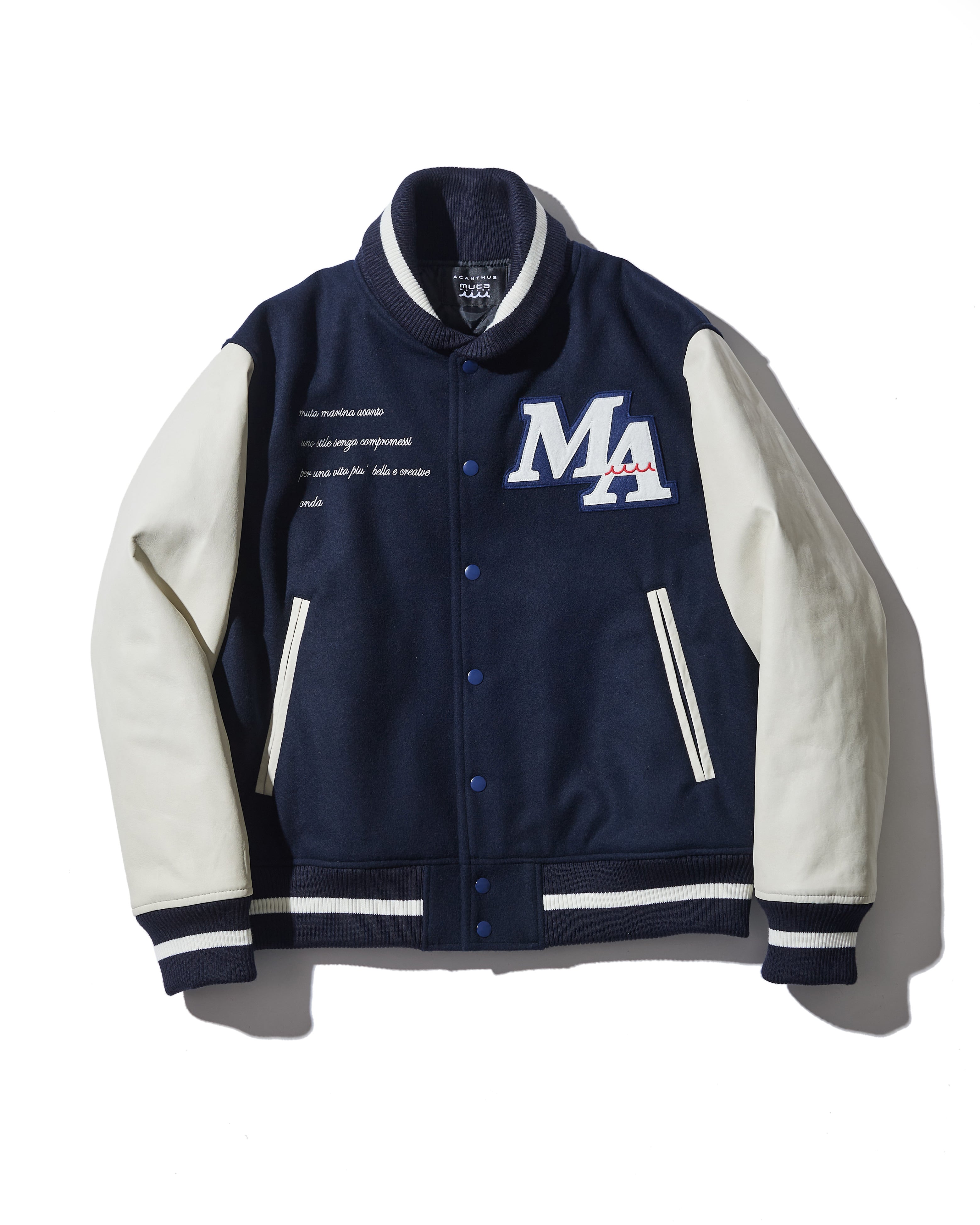 左胸にはコラボレーションを表すMAロゴアップリケを、バックにはオリジナルのスクリプトロゴアップリケを配置しています。